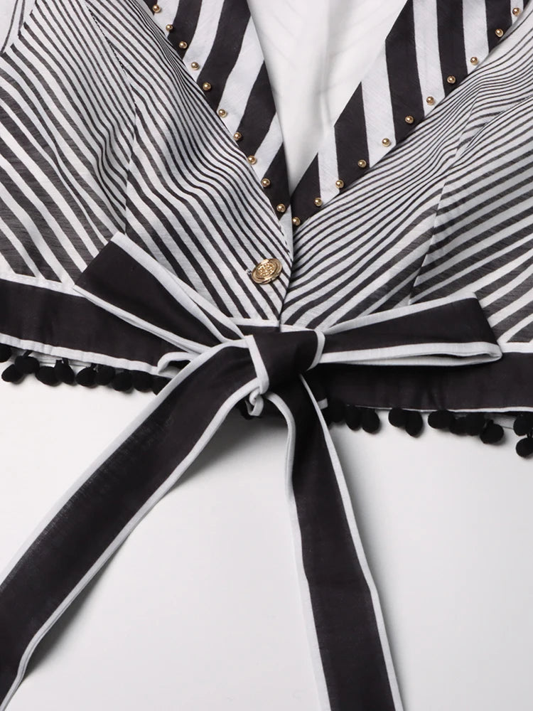 NastyENF Peripheral Striped V Neck Lantern Sleeve Top and High Waist A Line Skirt